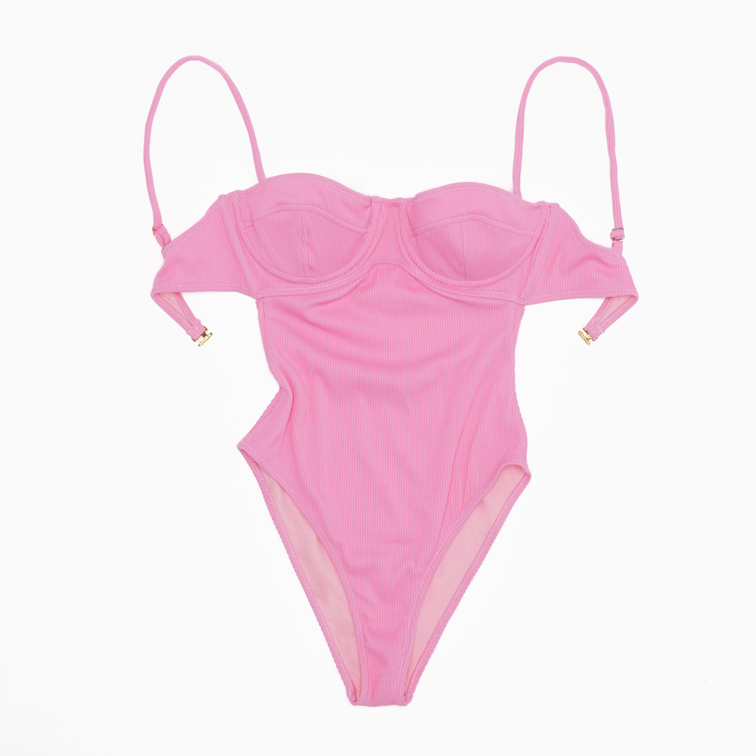Claudia, costume intero sgambato, con top balconcino ferretto con bretelle regolabili, apertura al centro dietro in metallo color oro.